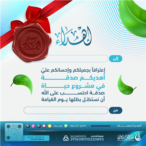 📩 فرصتك لتجعل لأحبابك ولمن تحب صدقة في مشروع حياة